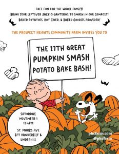 The 2025 Pumpkin Smash Potato Bake Bash is on November 1 from 12-4pm. Stop by with your Jack-O-Lanterns, and enjoy some baked potatoes, hot cider, and baked goods!