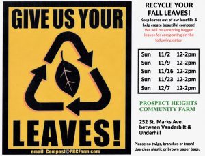 Bring your (or your neighbors’) leaves to Prospect Heights Community Farm! The leaf drop-off dates extend across five Sundays from 11/2 to 12/7 during compost shift hours (12-2pm). We will extend the drop-off period if needed.